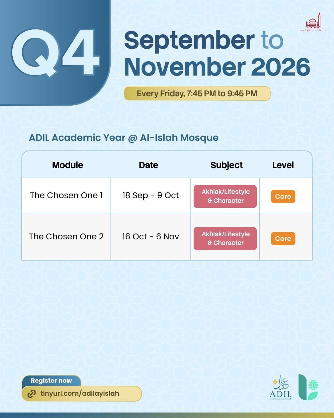 Al-Islah conducts ADIL Academic year. For this year, the class will be on every Friday, 745pm – 945pm via zoom. The ADIL Academic year consists of a 2-year course. Participants can choose to join modular courses on its own or choose to join the whole 2 year academic year.