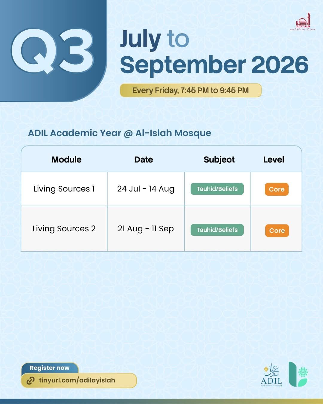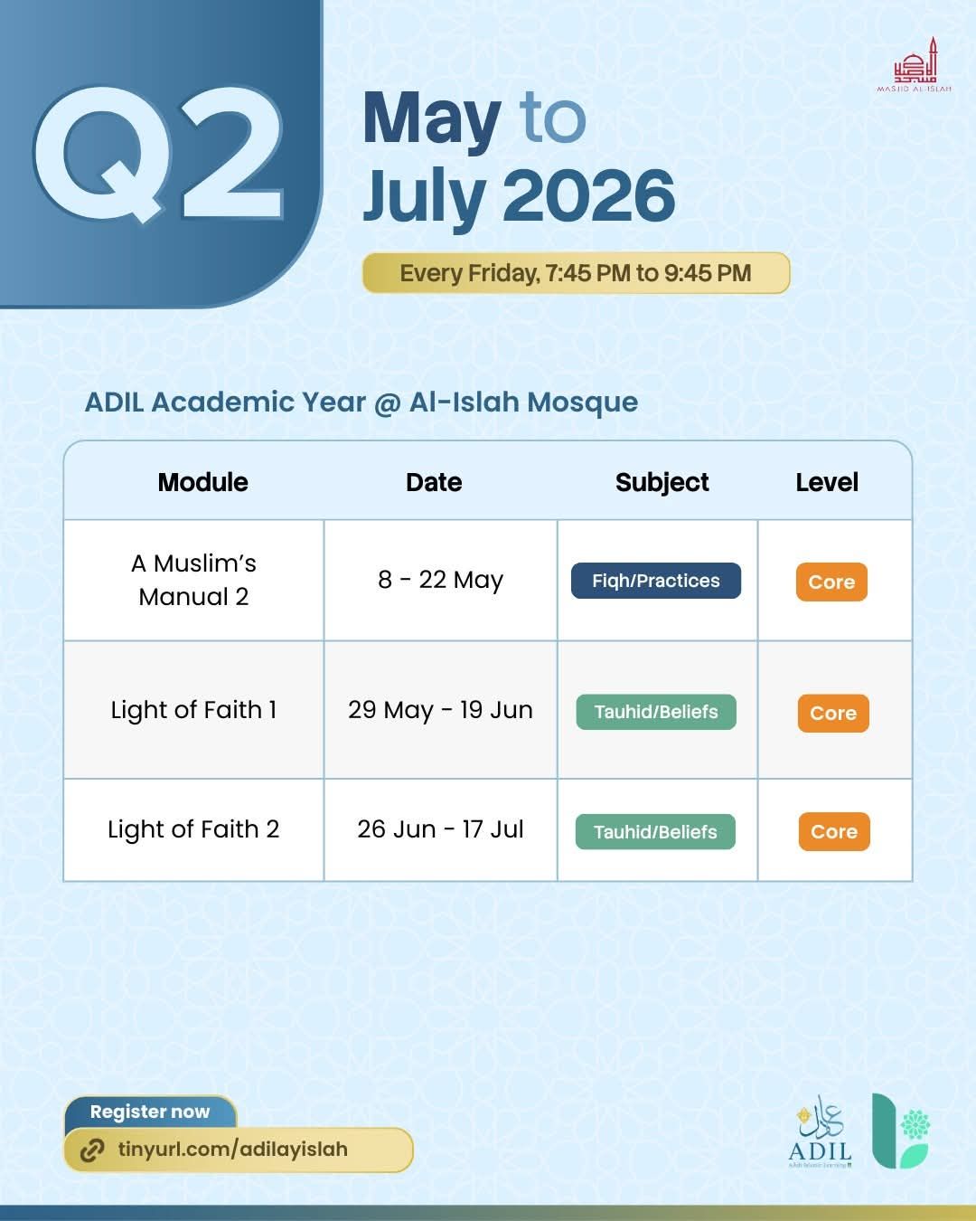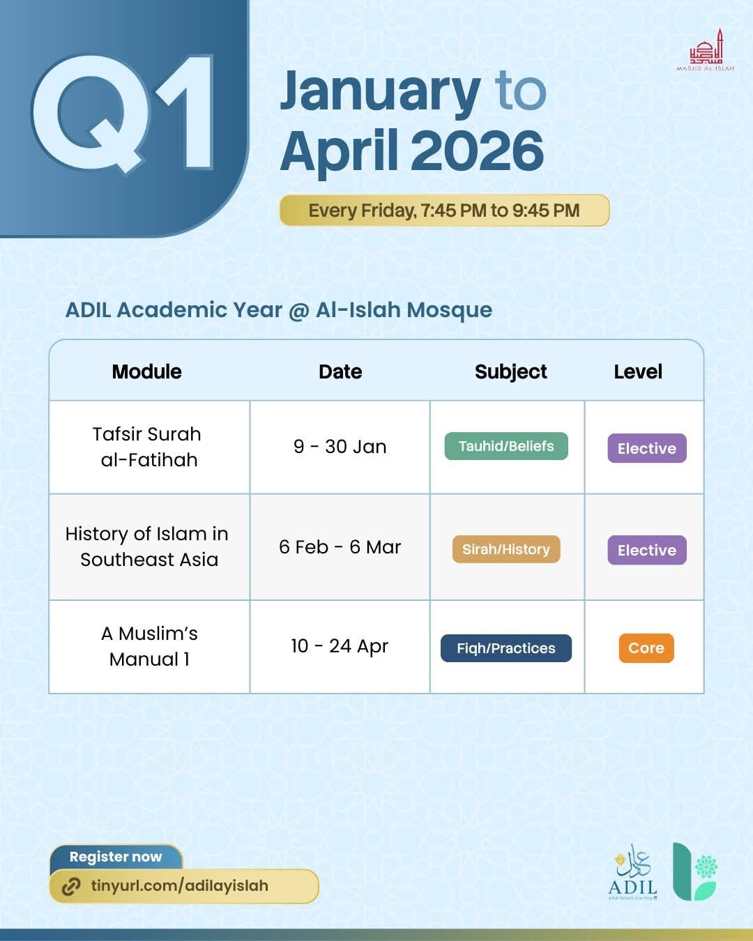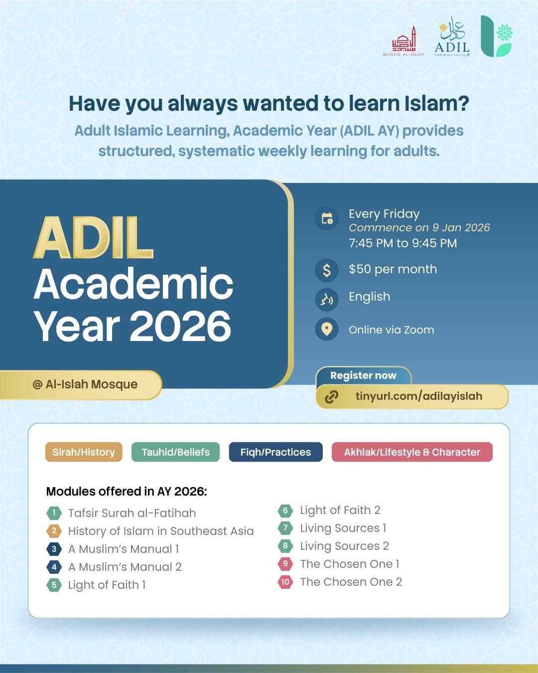 Al-Islah conducts ADIL Academic year. For this year, the class will be on every Friday, 745pm – 945pm via zoom. The ADIL Academic year consists of a 2-year course. Participants can choose to join modular courses on its own or choose to join the whole 2 year academic year.