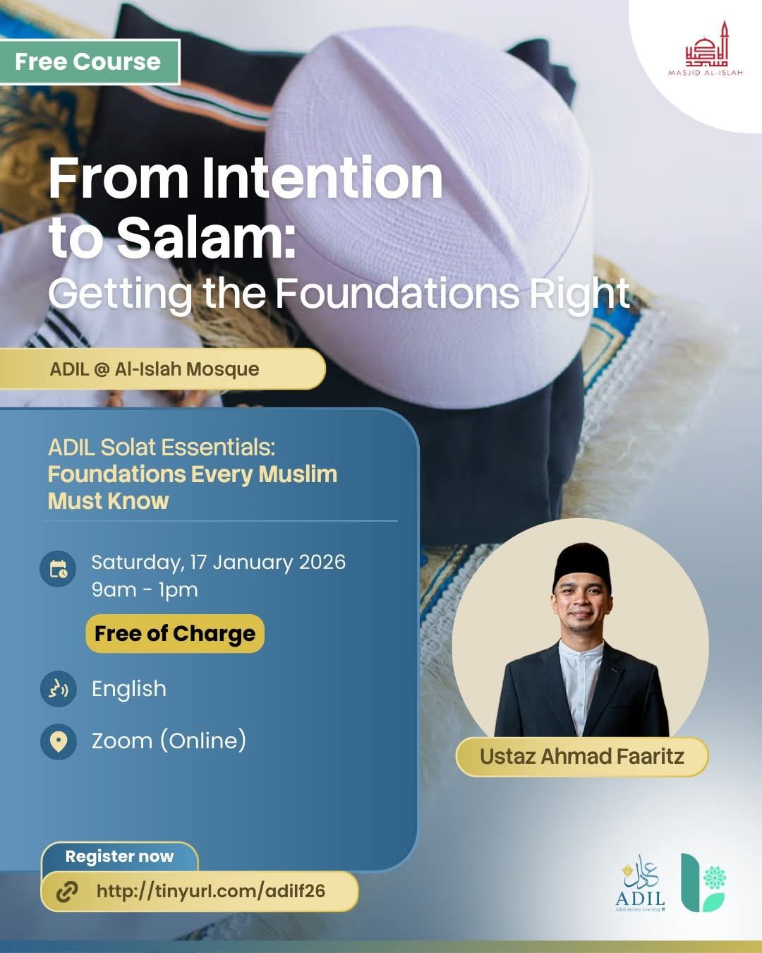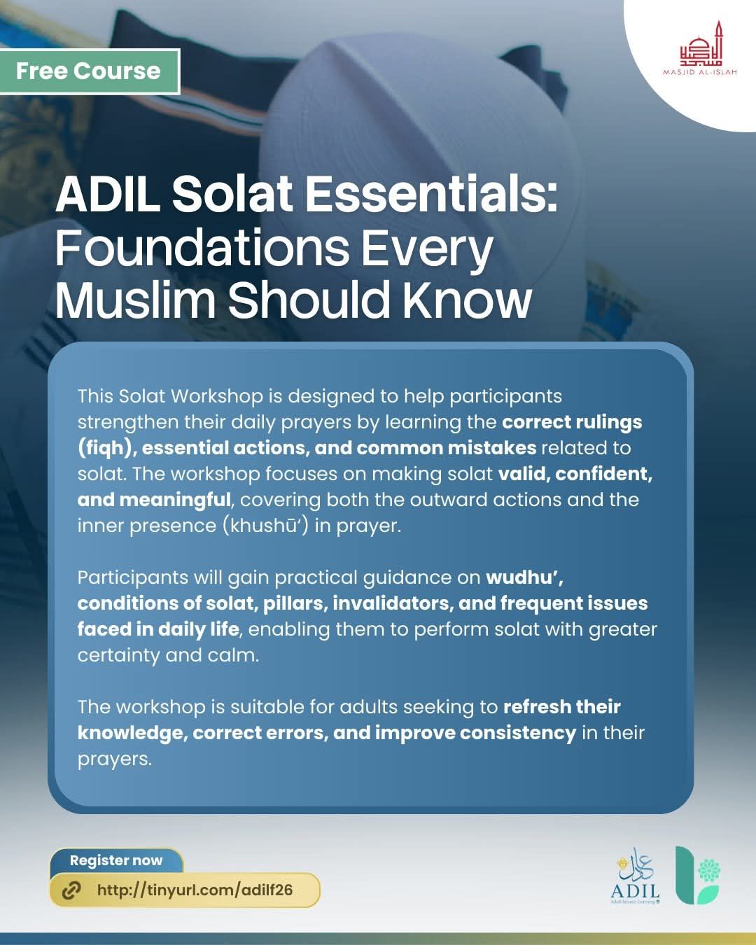🕌 ADIL Solat Essentials: Foundations Every Muslim Should Know From intention to salam, strengthen your solat with the essential knowledge every Muslim needs. Learn correct rulings, avoid common mistakes, and pray with confidence and khushūʿ.